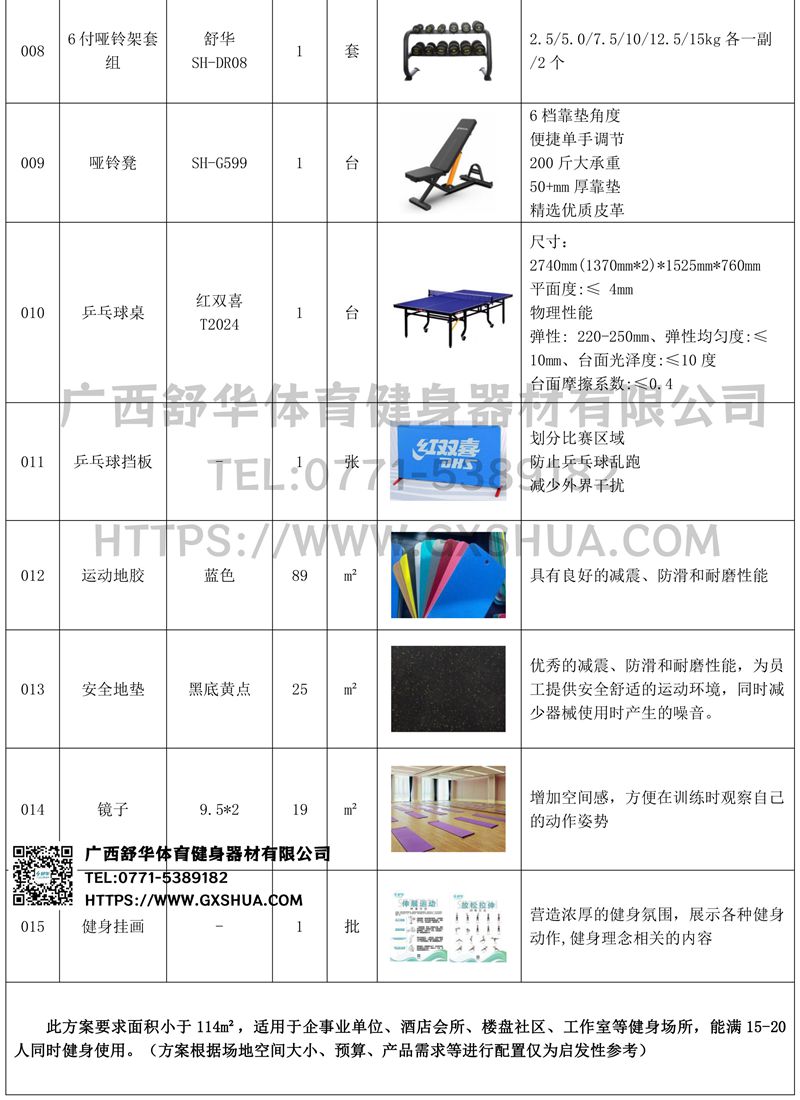 此方案要求面积小于114m²,适用于企事业单位、酒店会所、楼盘社区、工作室等健身场所,能满15-20人同时健身使用。(方案根据场地空间大小、预算、产品需求等进行配置仅为启发性参考)